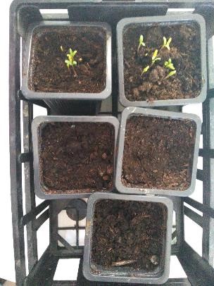 Les premières poussent sortent de terre ! Photos du 06/04, il n’y a que 3, 4 pousses dans 2 pots (œillets d’Inde) :