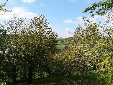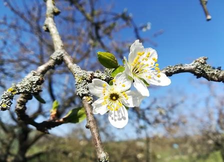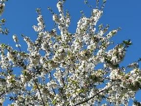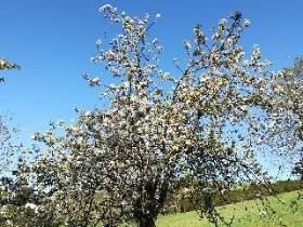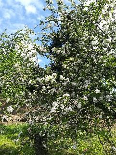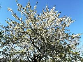 Photos des arbres fruitiers le 14/04, ils sont couverts de fleurs et les feuilles commencent à pousser :